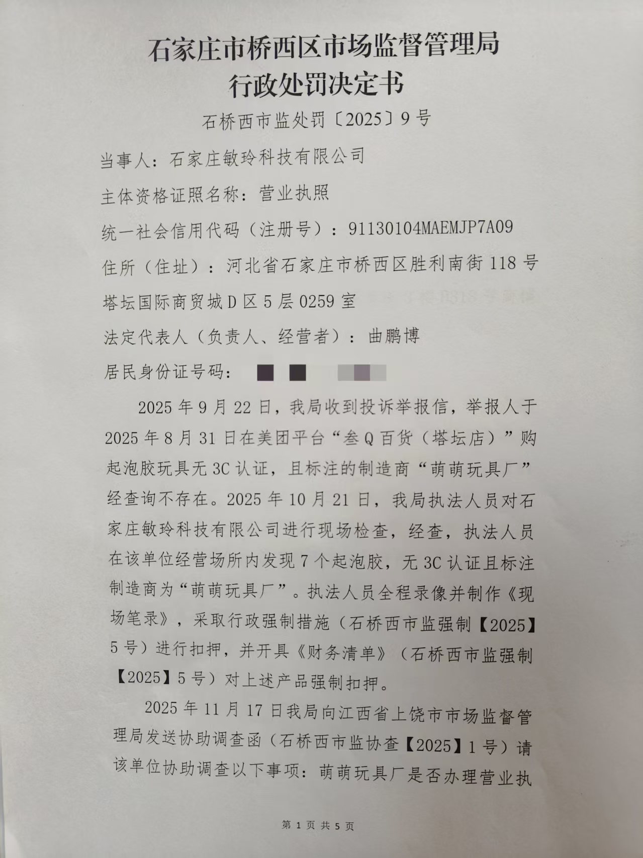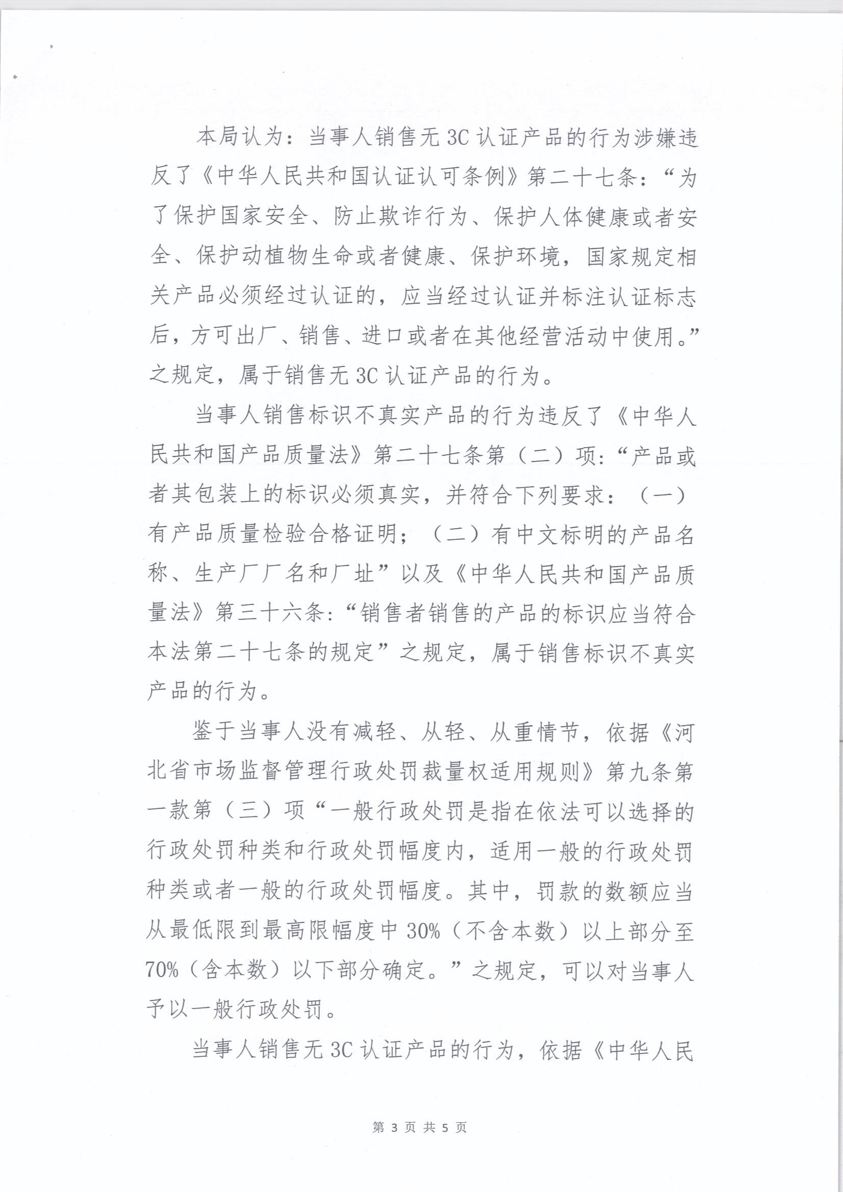 石家庄敏玲科技有限公司销售无3C认证的商品等行为案