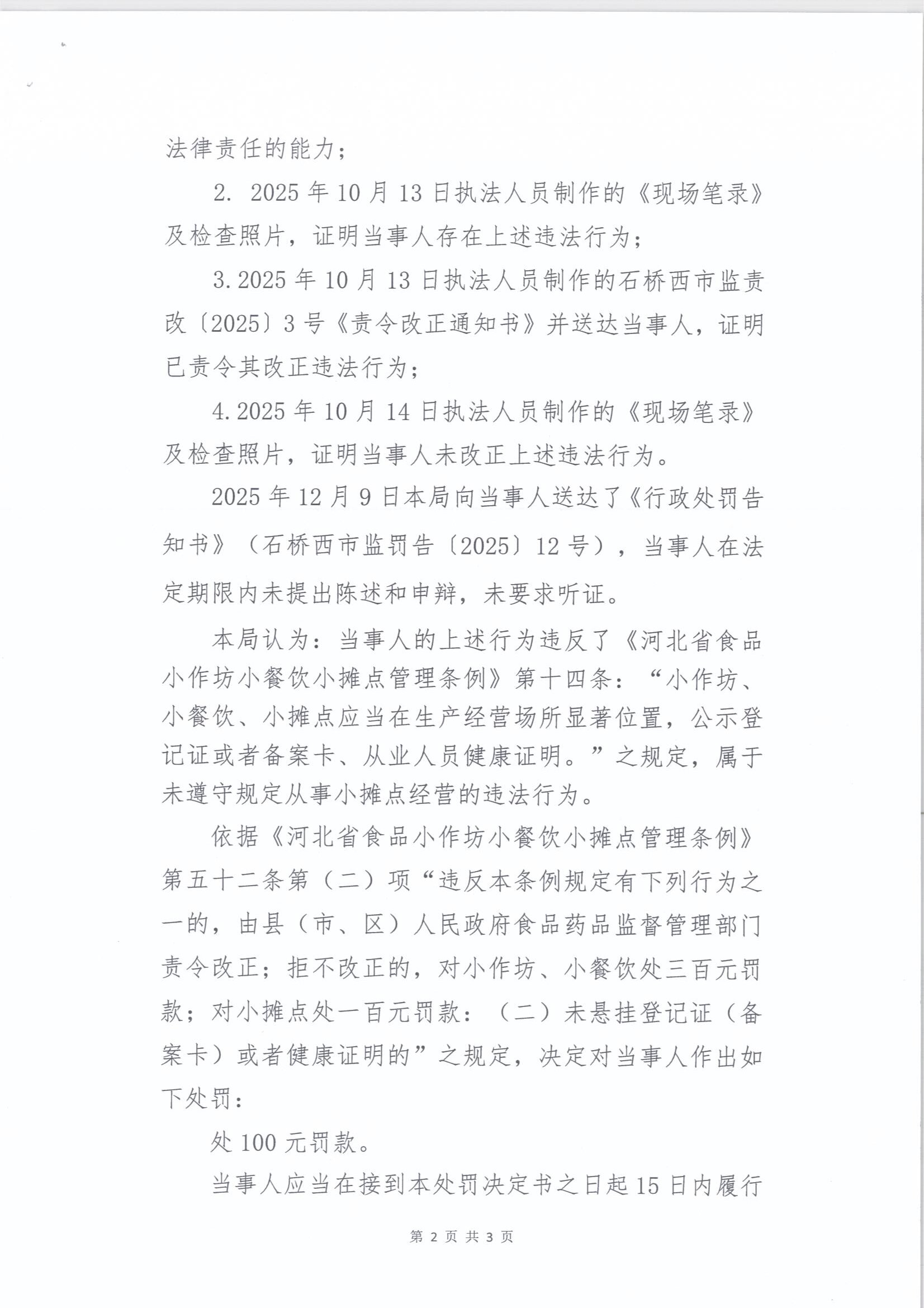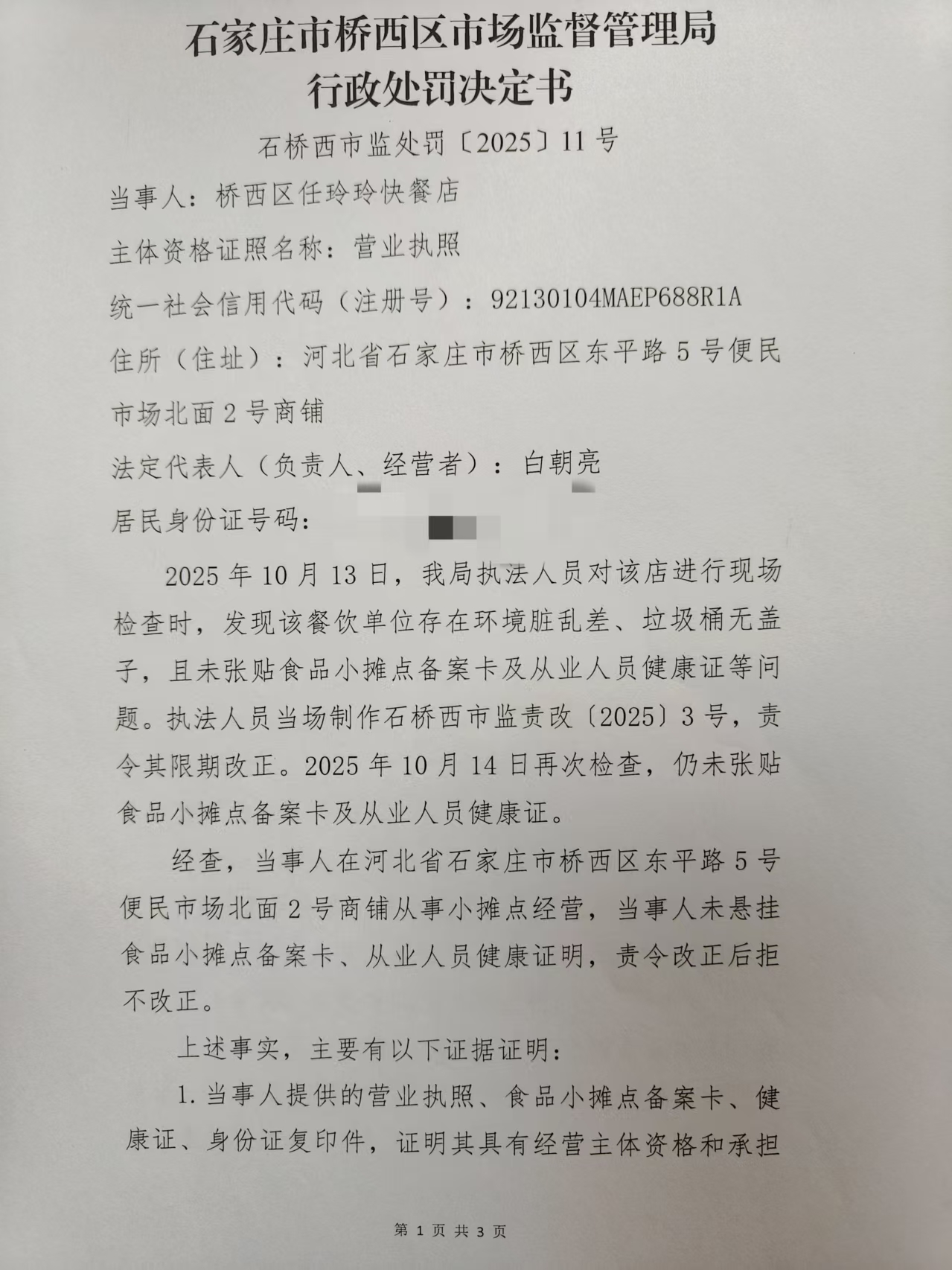 桥西区任玲玲快餐店未遵守规定从事小摊点经营案