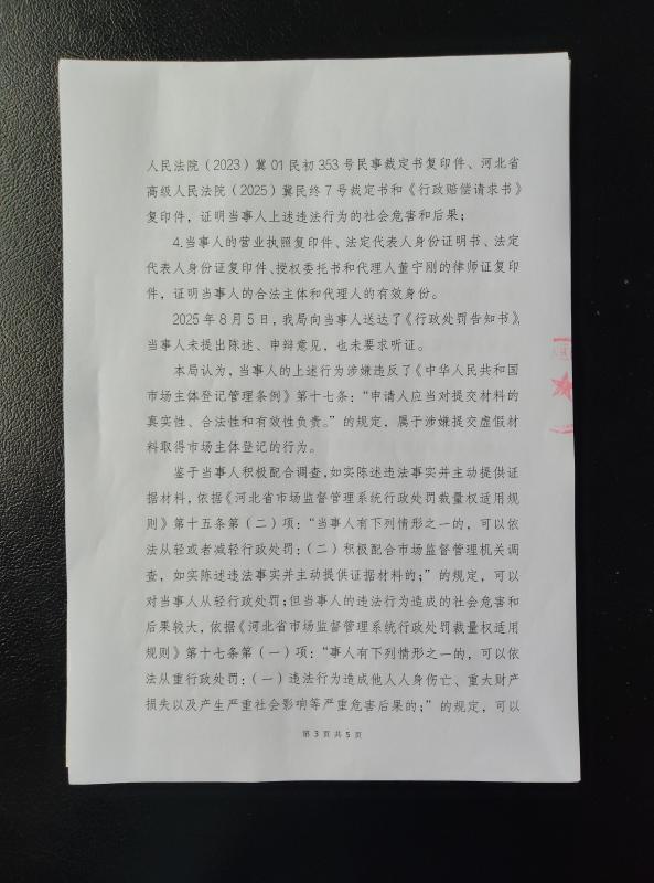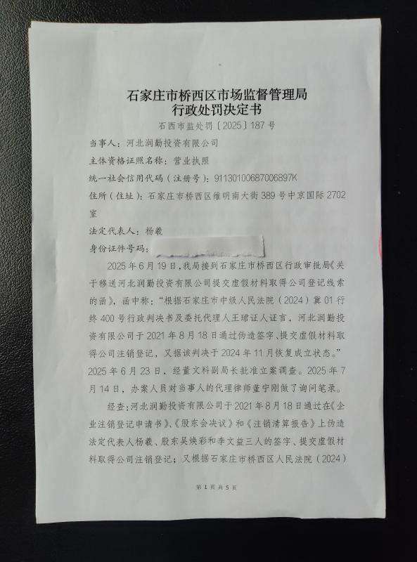 河北润勤投资有限公司提交虚假材料取得市场主体登记案