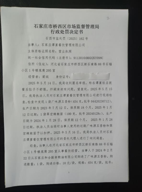 石家庄谭宴餐饮管理有限公司用超过保质期的食品原料生产食品案