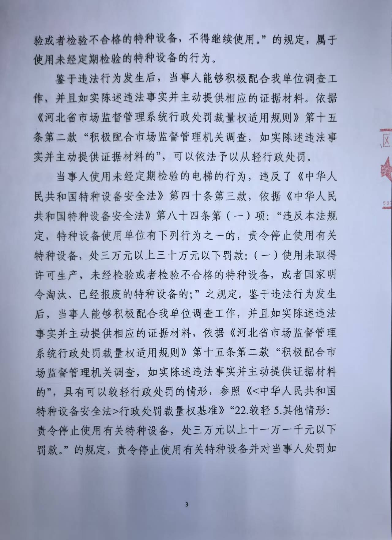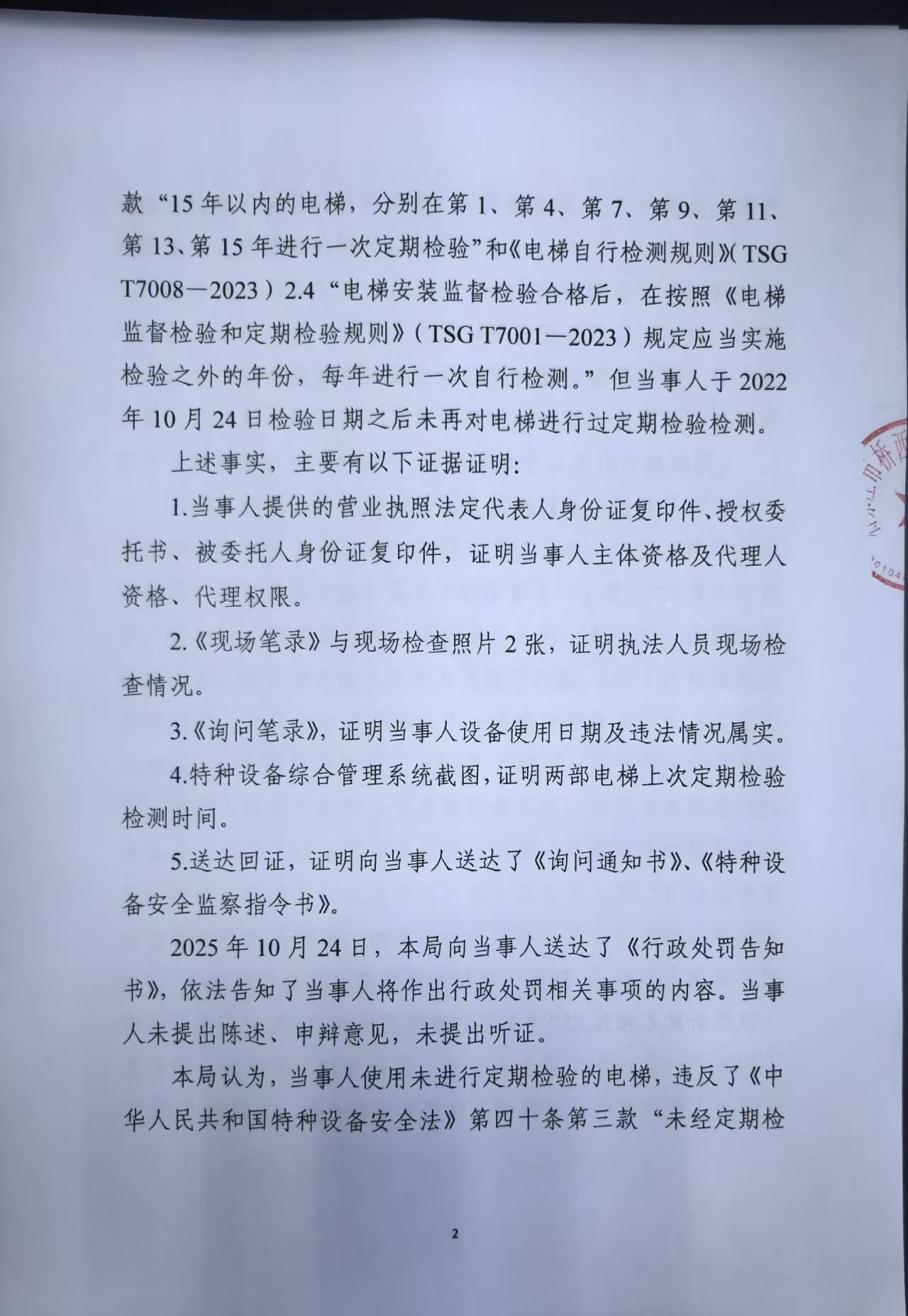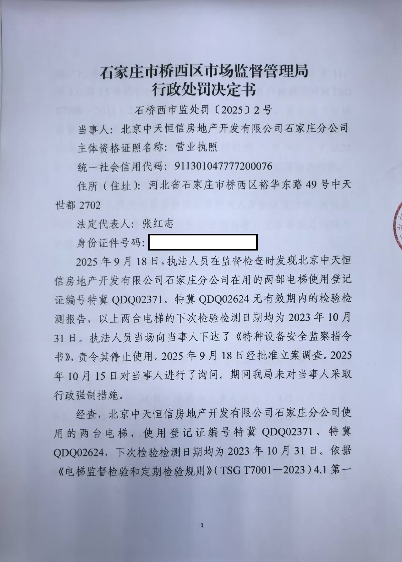 北京中天恒信房地产开发有限公司石家庄分公司使用未经定期检验的电梯案