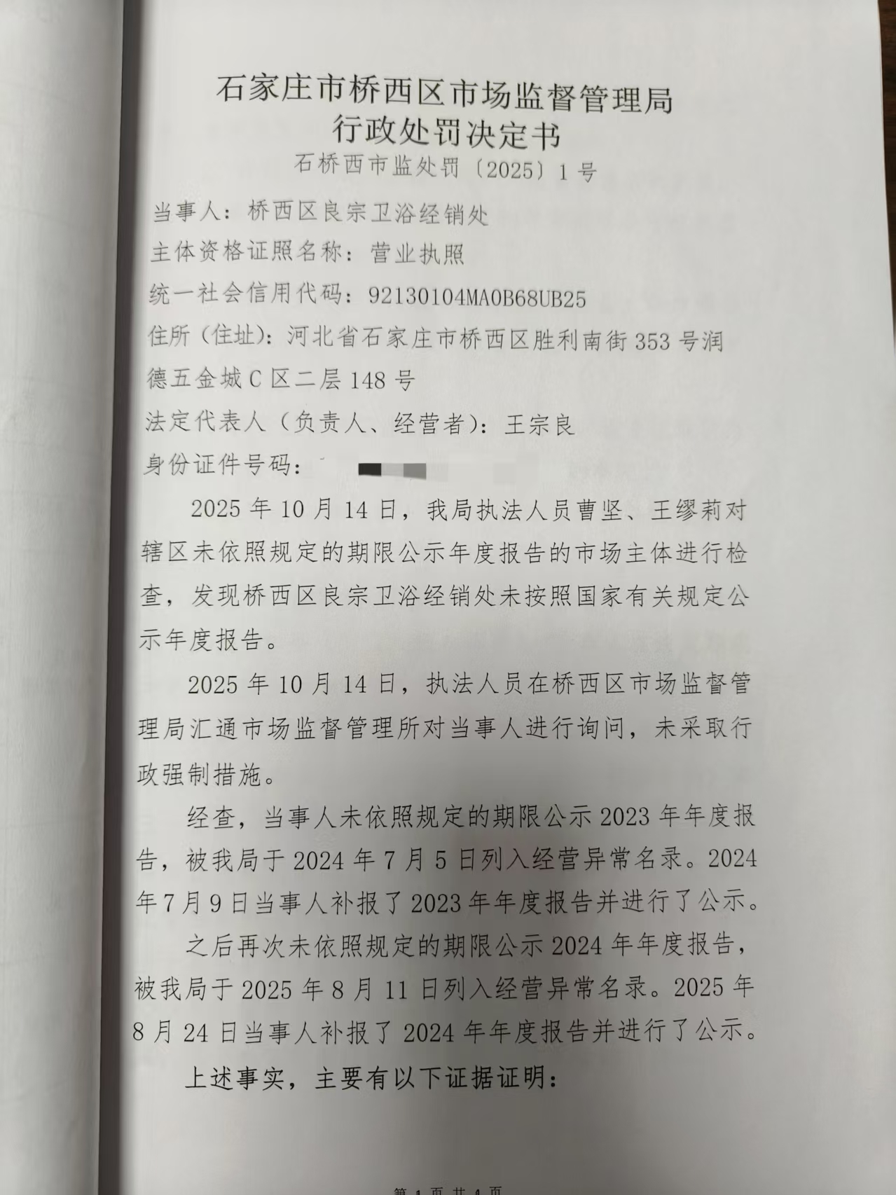桥西区良宗卫浴经销处未依照规定的期限公示年度报告案