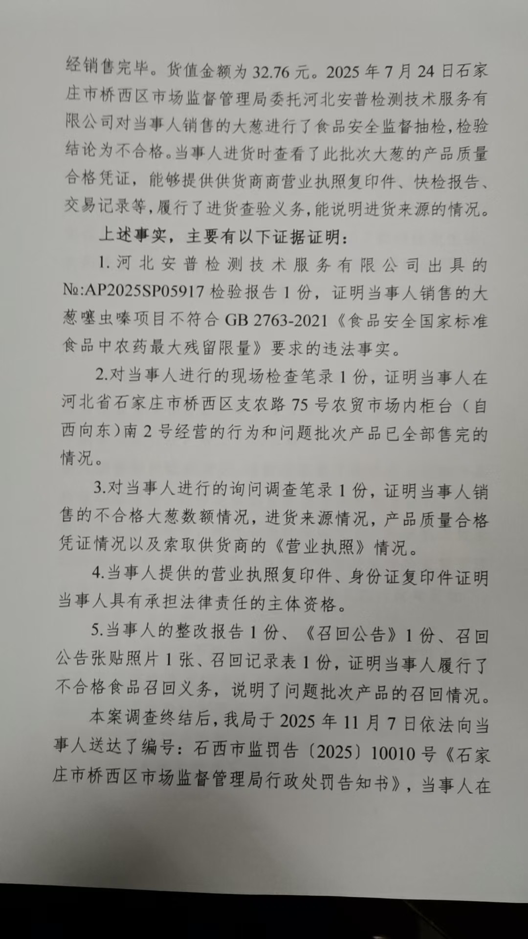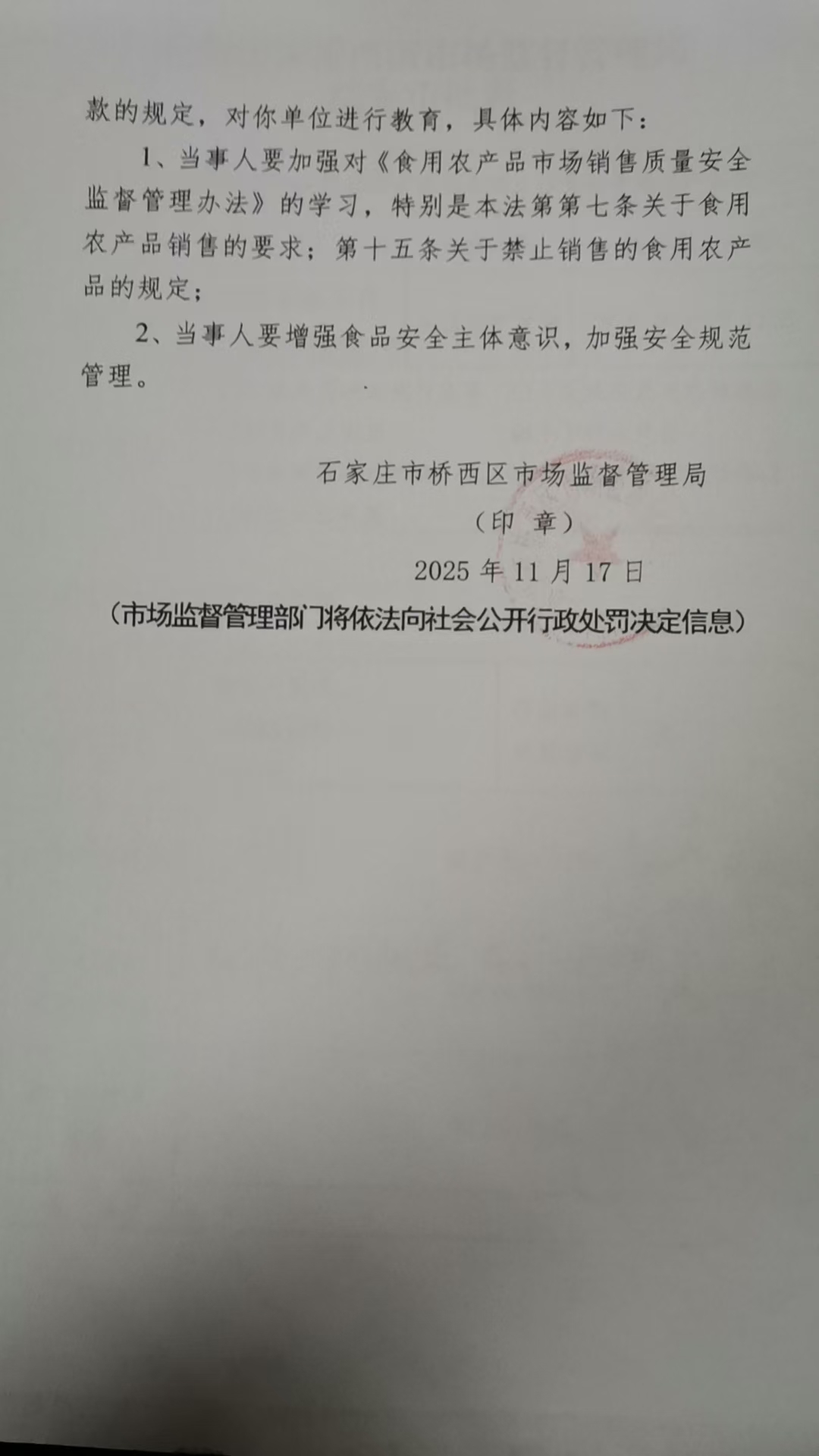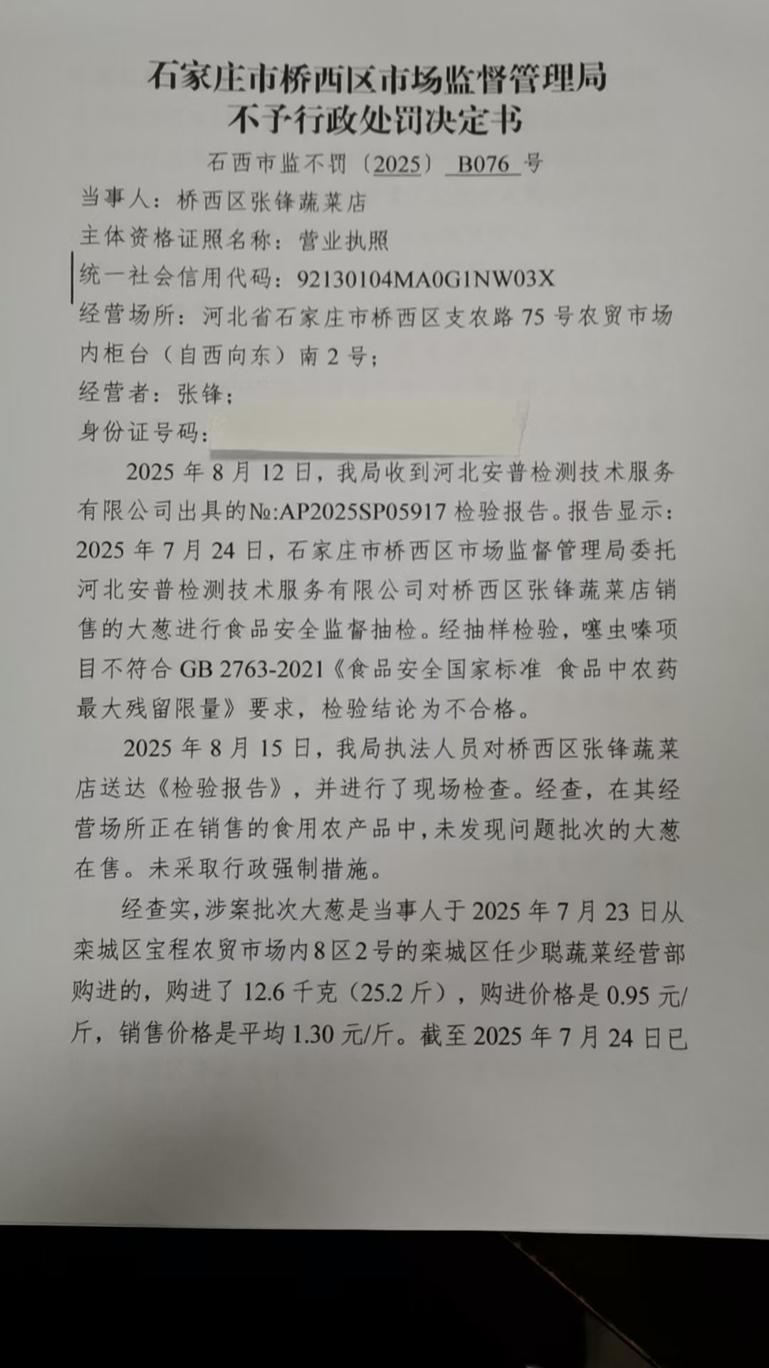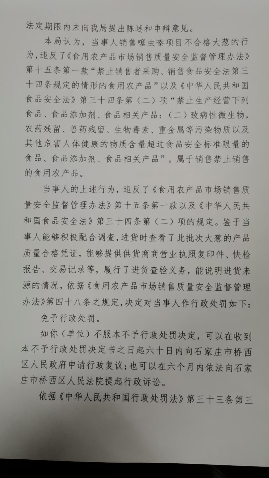 桥西区张锋蔬菜店销售禁止销售的食用农产品案