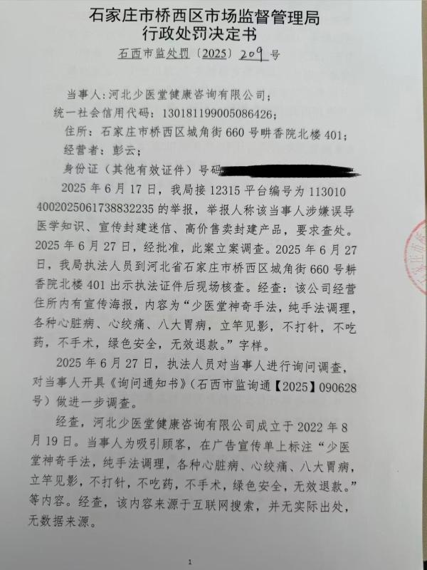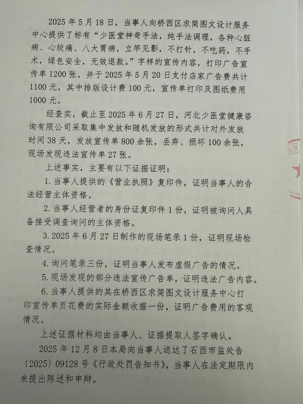 河北少医堂健康咨询有限公司涉嫌发布违法广告案