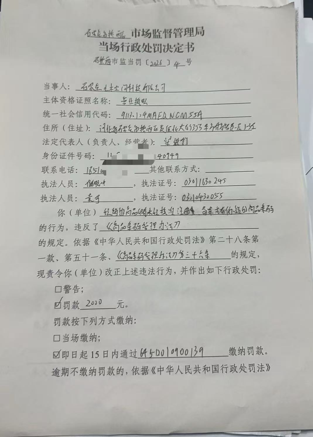 石家庄九木空间科技有限公司经销的商品印有未经核准注册、备案或者伪造的商品条码案
