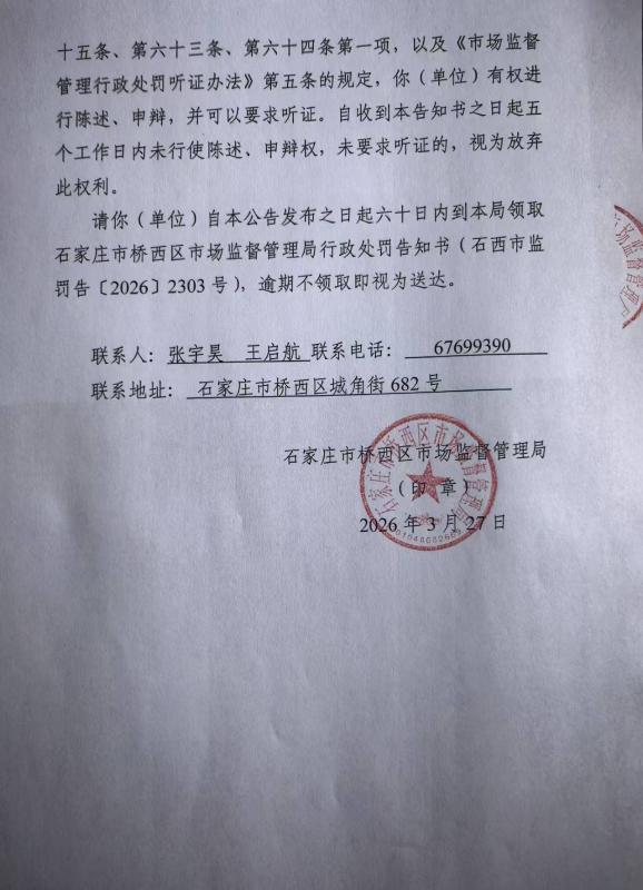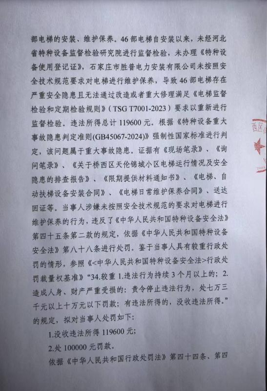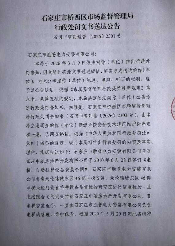 石家庄市桥西区市场监督管理局关于石家庄市胜普电力安装有限公司涉嫌未按安全技术规范维护保养电梯案行政处罚告知书的送达公告
