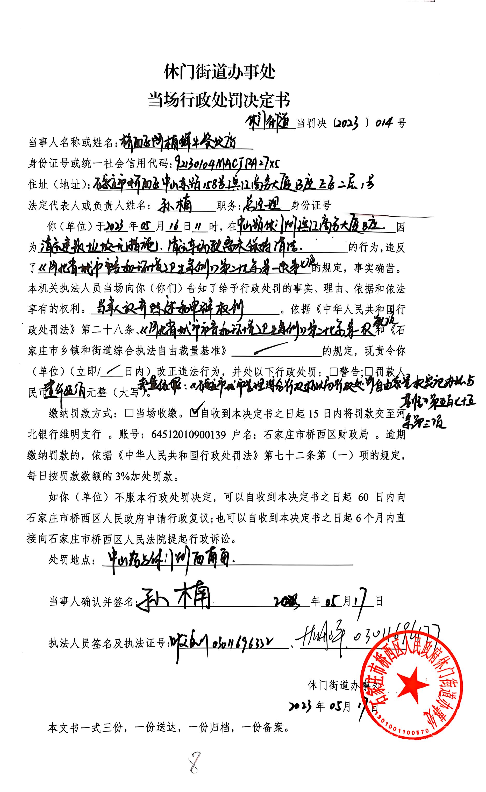 休门街道当罚决【2023】014号 | ||