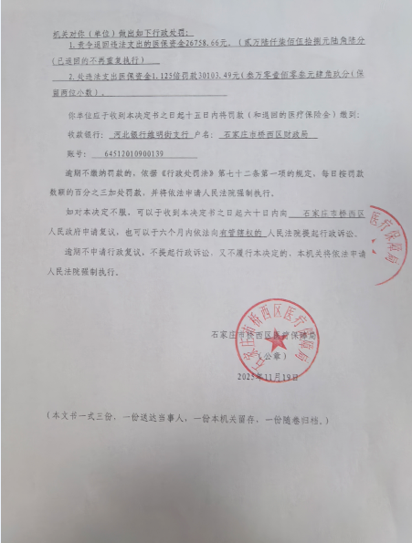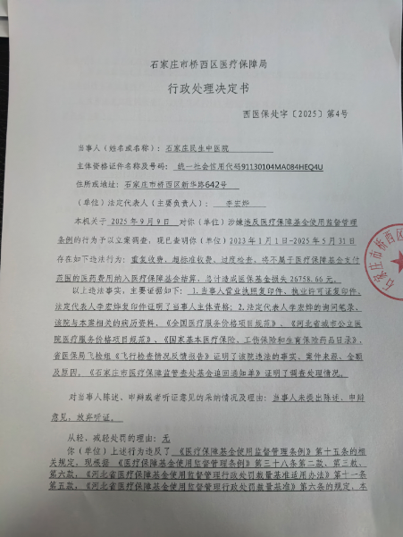 石家庄民生中医院违反医疗保障基金使用监督管理条例案
