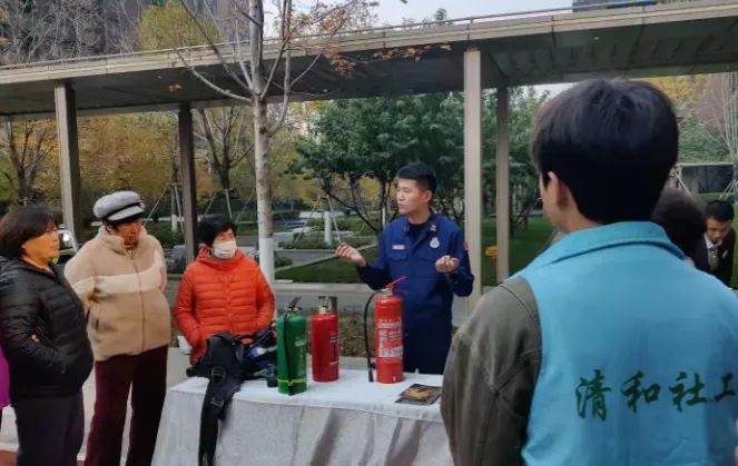 11月9日,汇通街道塔丰路社区共建服务队成员现场教学灭火器的正确使用方法,通过理论讲解与实操演练相结合的方式,使居民掌握了初期火灾扑救的基本技能。