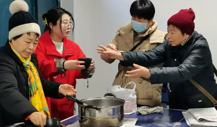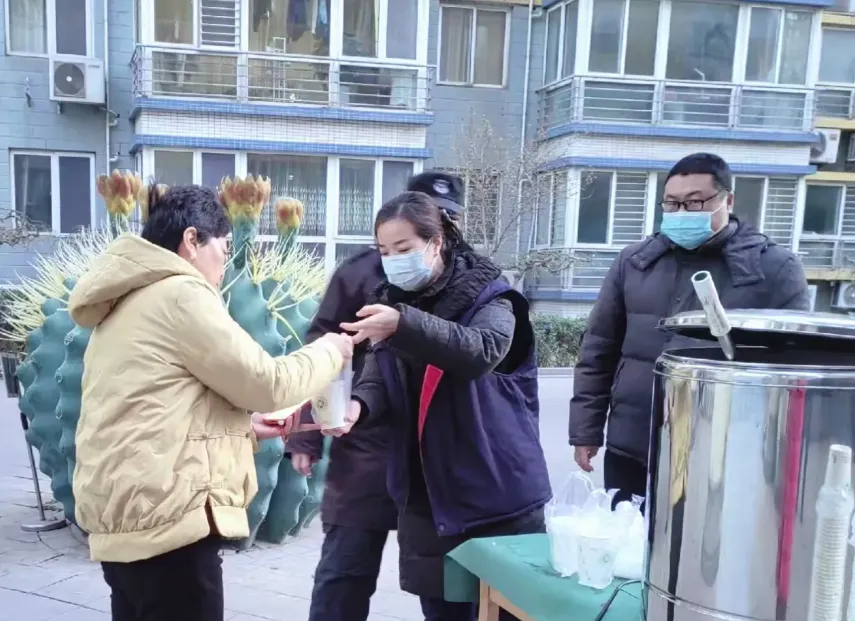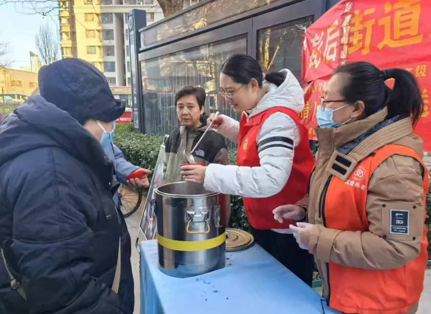 南长街道经八条社区工作人员、党员志愿者们早早忙碌起来,精心挑选糯米、红枣、桂圆等多种食材,小火慢熬,做成一碗碗热粥送到居民手中。