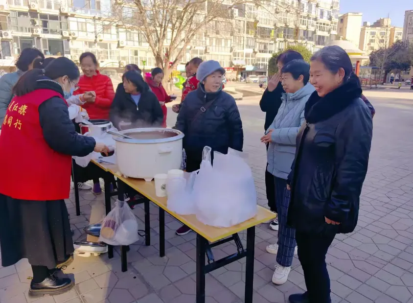 红旗街道旭城花园社区举办了一场温馨的送粥活动。大家喝着香甜的腊八粥,分享着生活的点滴,邻里情在这一刻更加深厚。