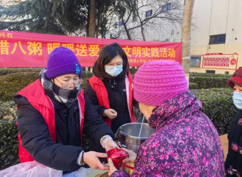 维明街道维明南大街社区将一碗碗热腾腾、汇聚了爱和祝福的腊八粥发放到环卫工人、快递小哥等手中,送上一份节日祝福。