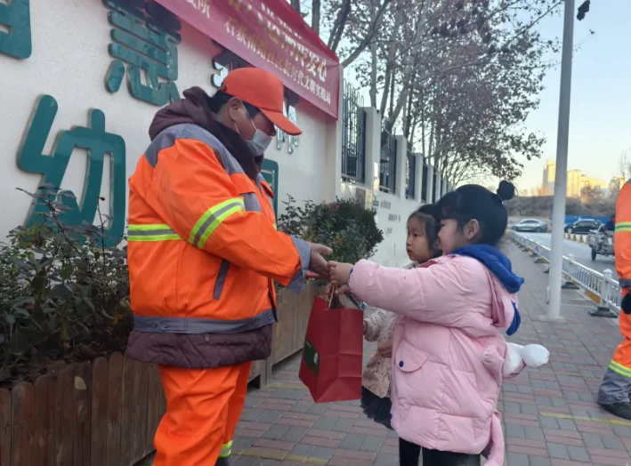 长兴街道石获南路社区组织孩子们将腊八粥和手套送到外卖骑手和环卫工人手中,用实际行动传递着爱与温暖。