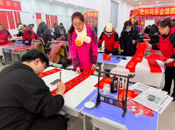 红旗街道宫尹社区的活动则延伸出特别的暖意。在日间照料站,书法老师妙笔生花,写下对新春的美好期许。志愿者们不仅服务现场,更将一副副春联与“福”字送至空巢、独居老人家中,让节日的喜庆叩响每一扇门,将社区的关怀送入每一颗心。