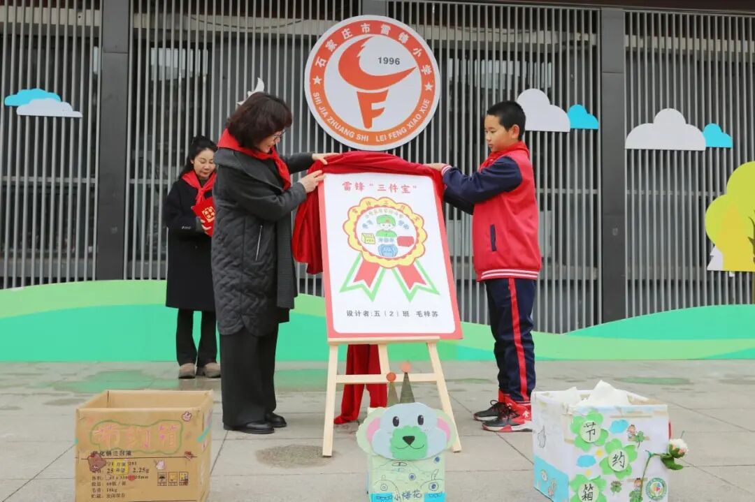 为纪念毛泽东同志“向雷锋同志学习”题词63周年,义卖开市前,由五年级二班的毛梓苏同学设计的雷锋“三件宝”纪念章正式亮相。储物盒、节约箱、针线包,在少年画笔下生动呈现,不仅将艰苦奋斗、勤俭节约的雷锋精神具象化,也展现出新时代青少年对雷锋精神的理解与传承。