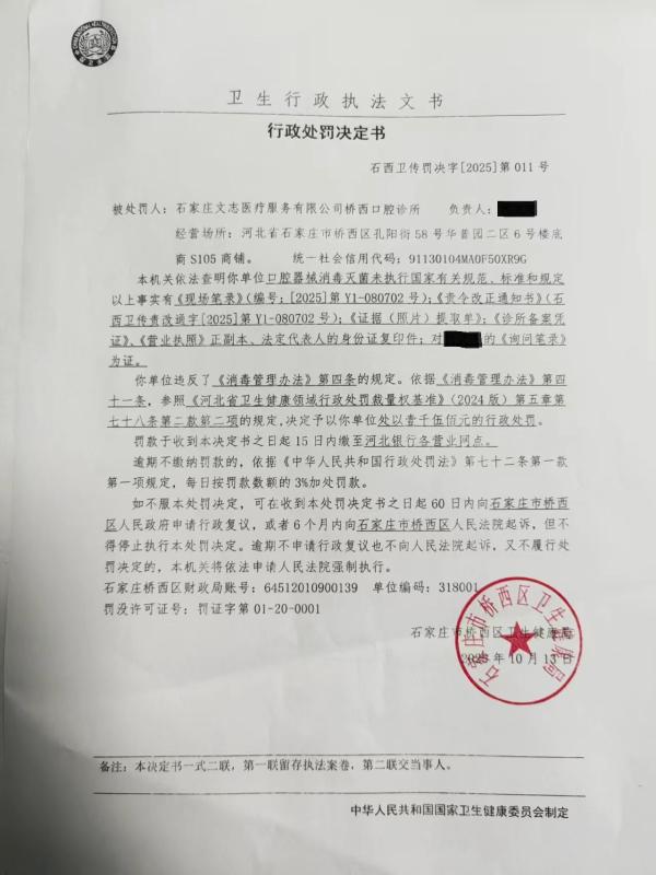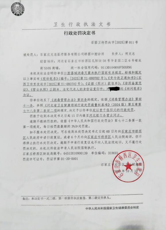 石家庄文志医疗服务有限公司桥西口腔诊所 行政处罚公示