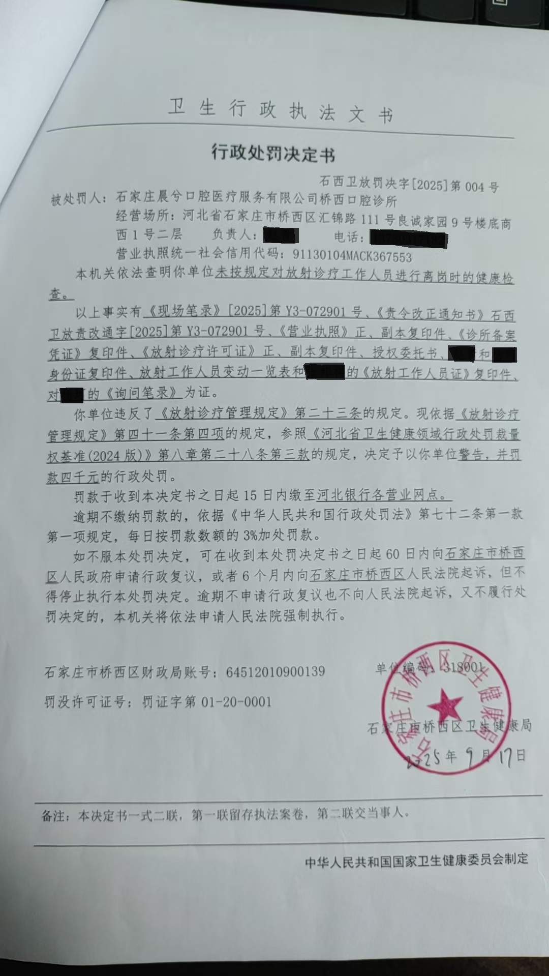 石家庄晨兮口腔医疗服务有限公司桥西口腔诊所 行政处罚公示