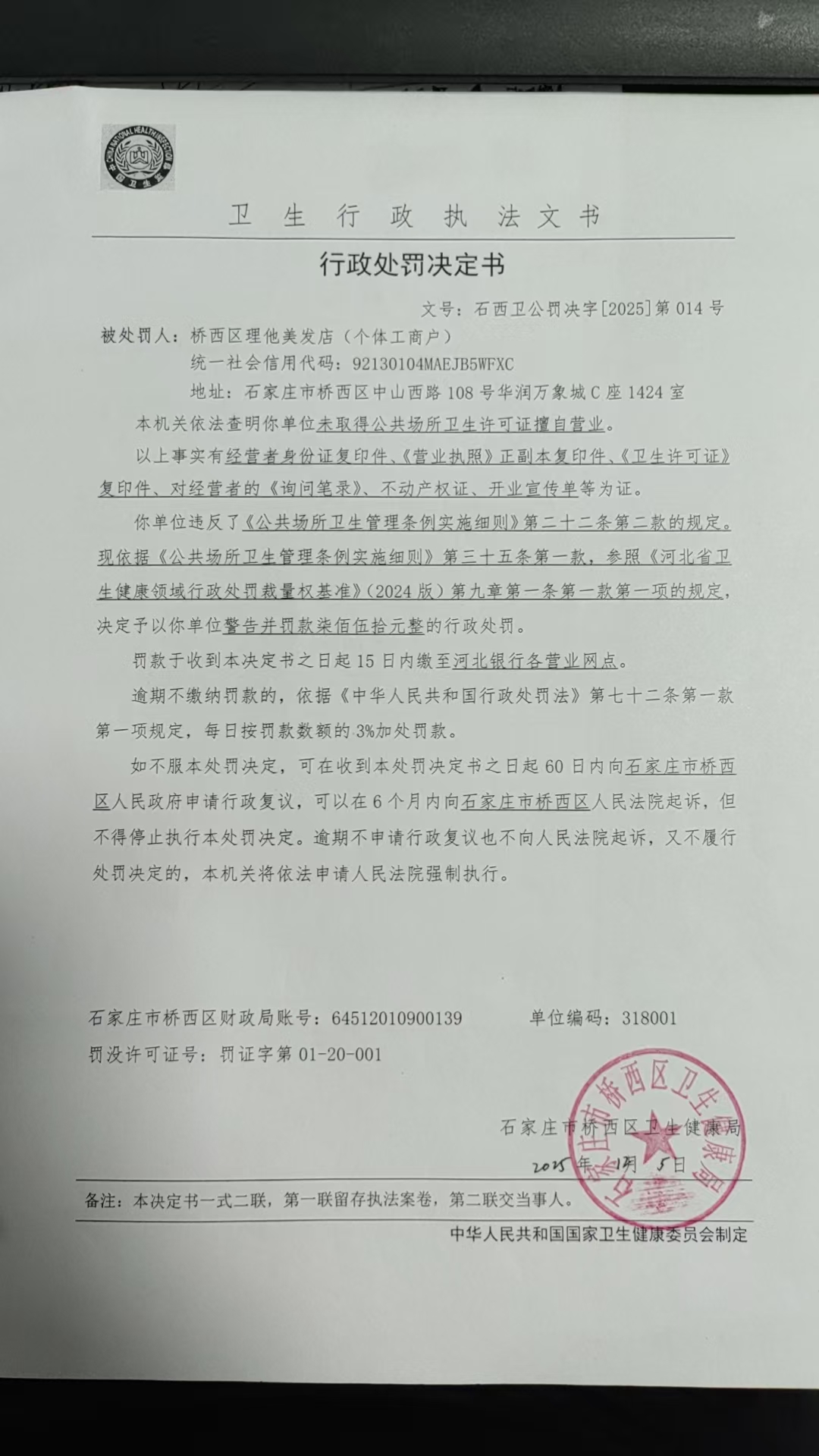 桥西区理他美发店(个体工商户) 行政处罚公示