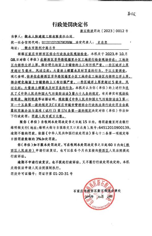 新石街道罚决【2023】0012号 衡水人防建筑工程有限责任公司芳华路悦福里小区工地积土较厚、渣土裸露扬尘