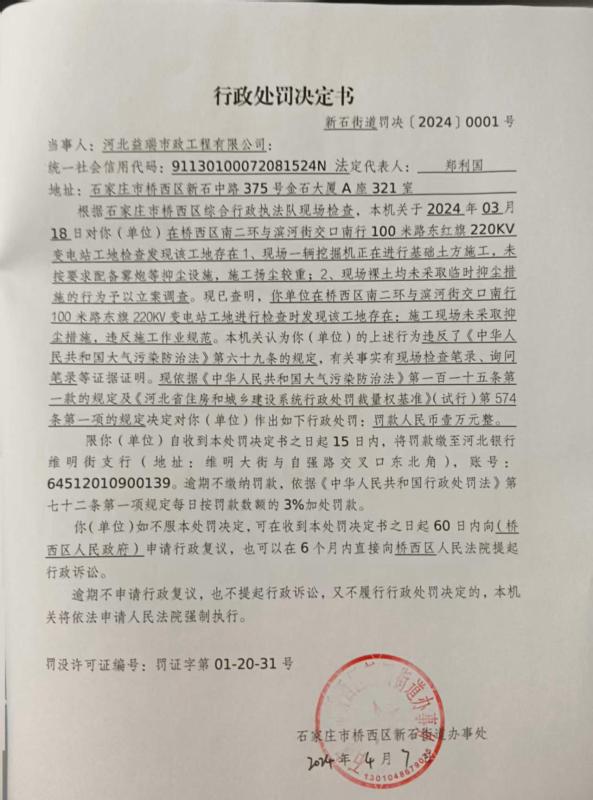 新石街道罚决【2024】0001号 河北益瑞市政工程有限公司红旗变电站工地未采取抑尘防治措施