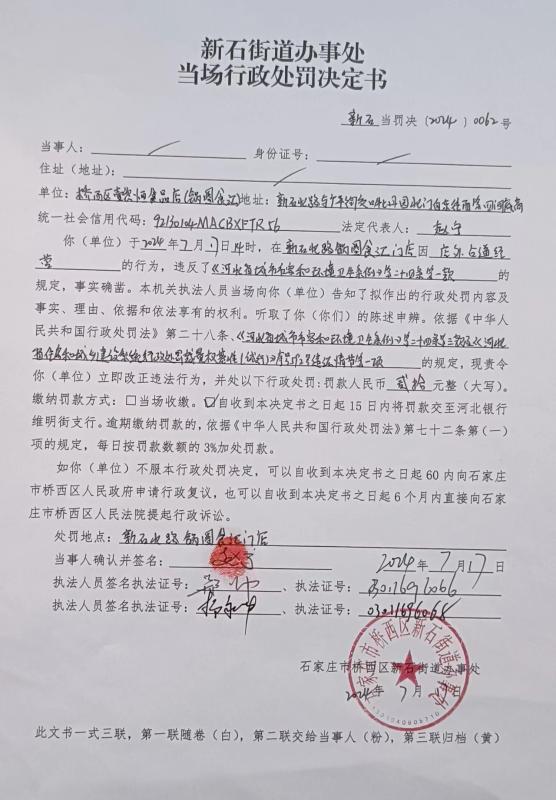 新石当罚决【2024】0062号 桥西区懿恒食品店(锅圈食汇)在新石北路店店外经营