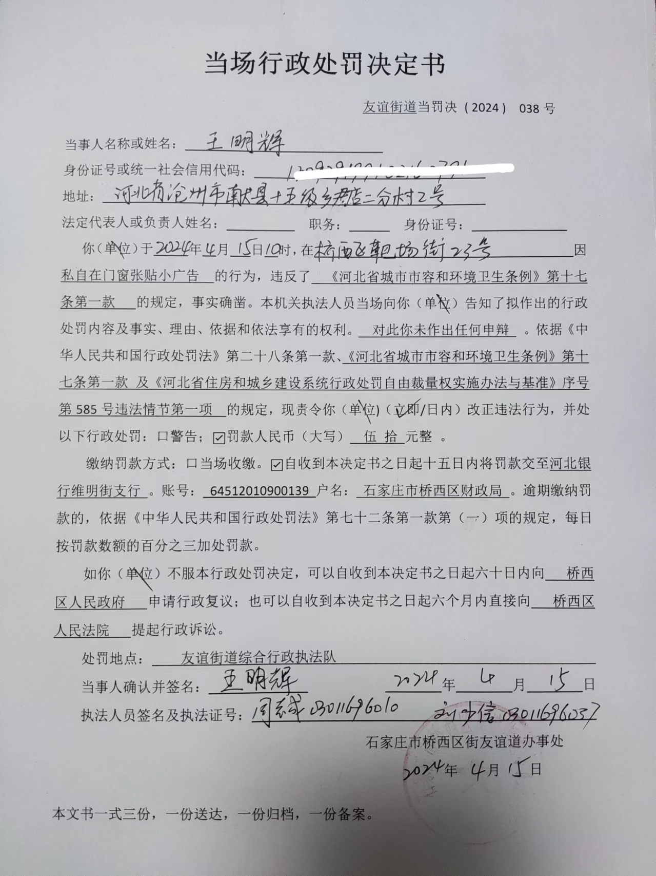王明辉在桥西区靶场街23号擅自在门窗张贴小广告