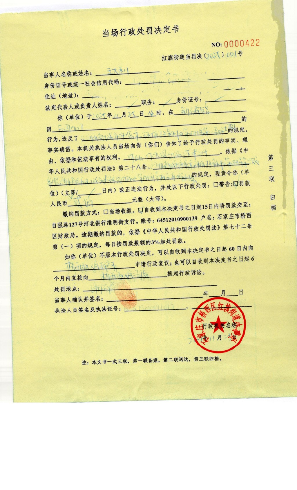 2025年11月25日,我街道执法人员巡查到新石南路,发现王大利擅自在街道两侧占道加工。违反了《河北省城市市容和环境卫生条例》第四十条第一款第五项之规定。 | ||