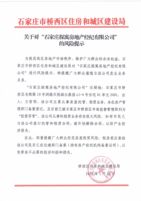 关于对“石家庄探寓房地产经纪有限公司”的风险提示