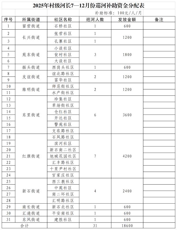 根据省、市关于加强河长制工作通知精神,为做好我区村级河长巡河工作,现对2025年村级河长7-12月份巡河补助资金分配情况进行公示,公示期为2026年2月5日至2月11日。公示期间,如对补助资金情况有异议,请在公示期内向区河长制办公室反馈,过期不再受理。