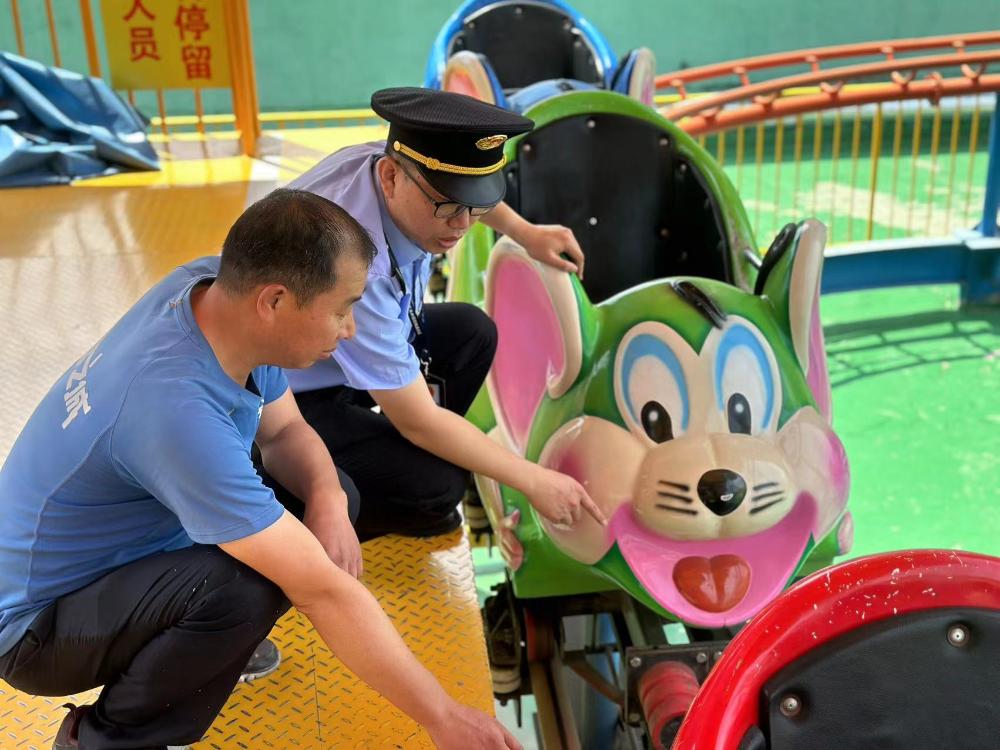 以旋转塔、疯狂老鼠等游乐设施安全运行为重点,查看游乐设施设备保养检验、作业人员证件、安全管理制度运行、应急预案及演练等记录,督促经营者严格落实主体责任,增强安全防范意识,为孩子们营造安全放心的环境。