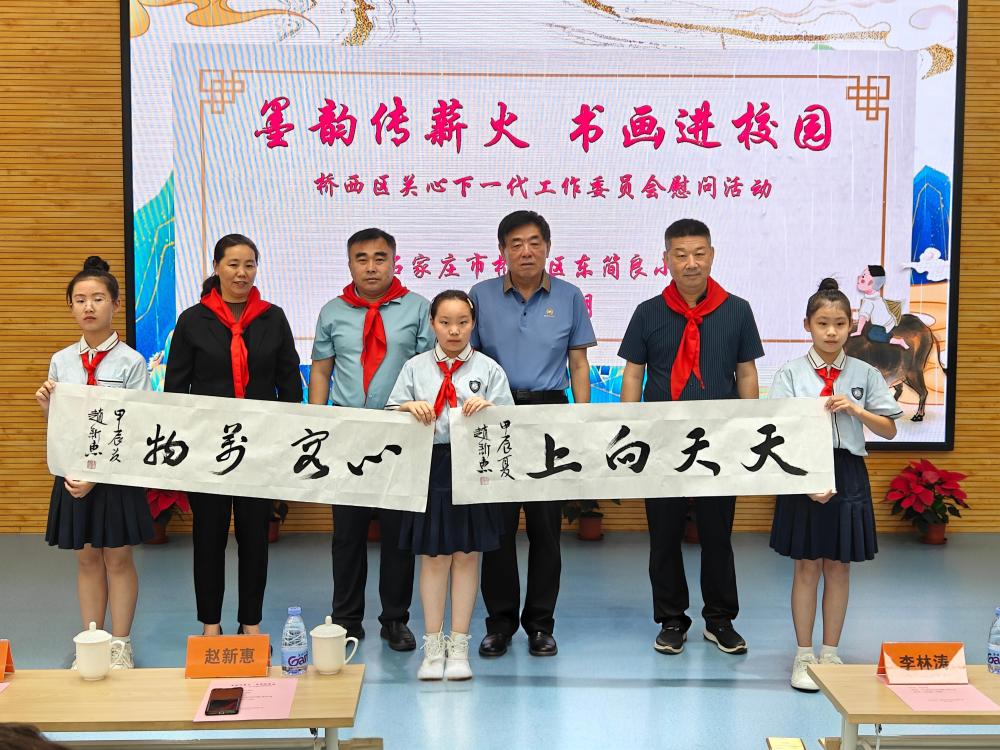 5月29日,桥西区关工委、区教育局、区老年书画研究会及区美协、书协在东简良小学联合举办“墨韵传薪火,书画进校园”迎六一慰问活动。