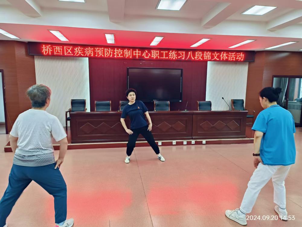 为增强职工体质,丰富职工的多彩文化生活,近日,桥西区疾病预防控制中心特邀请专业老师为全体职工进行健身操“八段锦”的培训练习。
