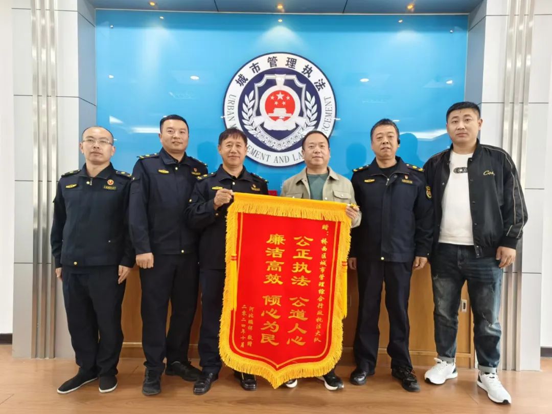 近日,桥西辖区某企业将一面写有“公正执法 公道人心 廉洁高效 倾心为民”的锦旗,真诚的赠予桥西区城管综合行政执法大队,对执法人员热情高效的服务表示感谢。
