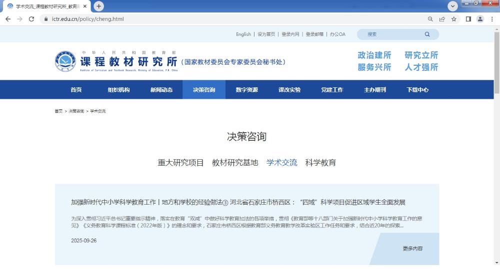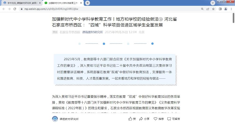 近日,教育部课程教材研究所以《河北省石家庄市桥西区:“四域”科学项目促进区域学生全面发展》为题,对桥西区在新时代中小学科学教育方面的典型经验与创新做法进行了宣传推广。这是教育部面向全国义务教育教学改革实验区和科学教育实验区成果推广的重要组成部分,体现了桥西区科学教育探索的示范价值。