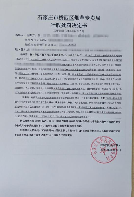 石家庄市桥西区烟草专卖局行政处罚决定书公示(石桥烟处【2025】第042号)