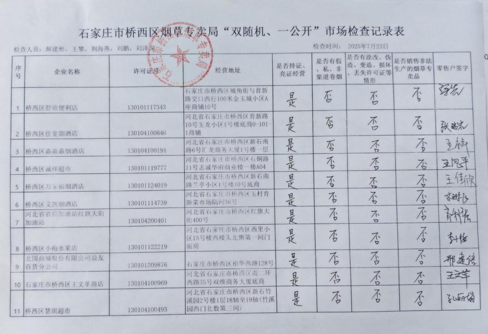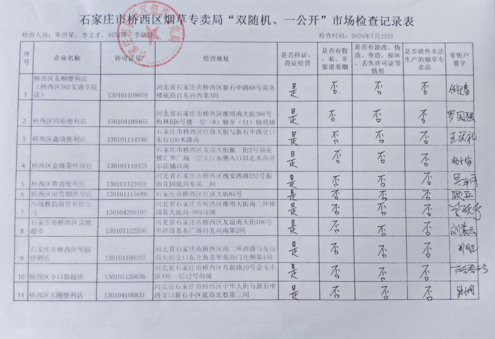 石家庄市桥西区烟草专卖局“双随机、一公开”公示