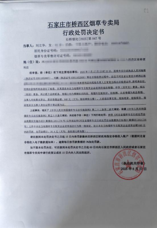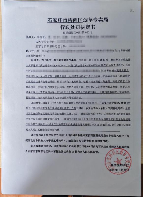 石家庄市桥西区烟草专卖局行政处罚决定书公示(石桥烟处【2025】第050、047号)