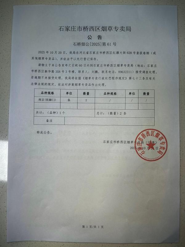 石家庄市桥西区烟草专卖局公告找人(石桥烟公【2025】】第61号)