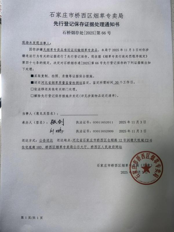 石家庄市桥西区烟草专卖局先行登记保存证据处理通知书(石桥烟存处【2025】第66号)
