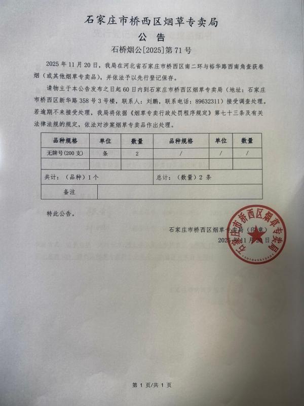 石家庄市桥西区烟草专卖局公告找人(石桥烟公【2025】】第71号)