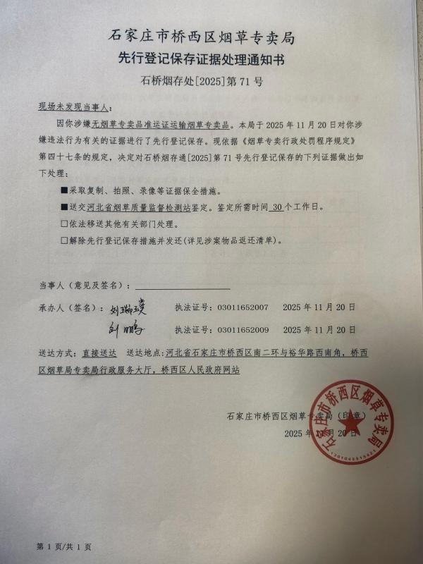 石家庄市桥西区烟草专卖局先行登记保存证据处理通知书(石桥烟存处【2025】第71号)