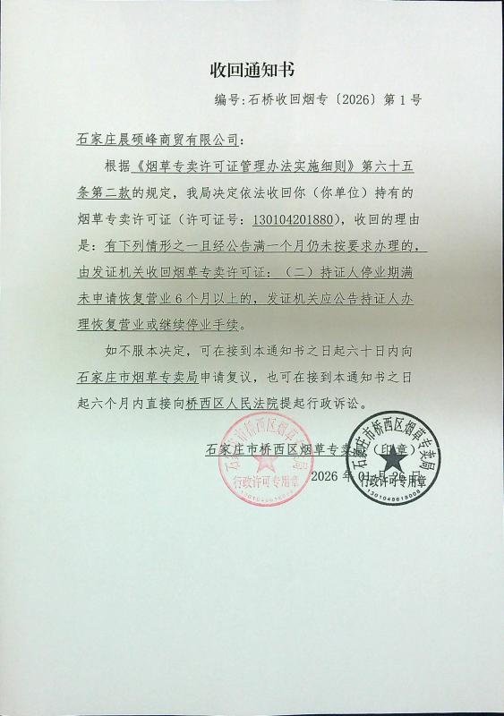 本局依据《烟草专卖许可证管理办法实施细则》第六十八条规定,作出收回你烟草专卖零售许可证(130104201880)的许可决定,现将《收回通知书》(石桥收回烟专〔2026〕第1号)予以公告送达。
