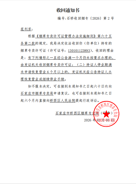本局依据《烟草专卖许可证管理办法实施细则》第六十八条规定,作出收回你烟草专卖零售许可证(130101123893)的许可决定,现将《收回通知书》(石桥收回烟专〔2026〕第2号)予以公告送达。