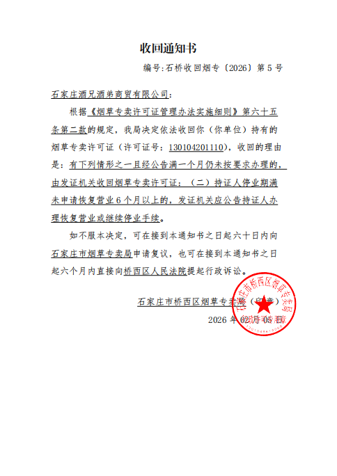 本局依据《烟草专卖许可证管理办法实施细则》第六十八条规定,作出收回你烟草专卖零售许可证(130104201110)的许可决定,现将《收回通知书》(石桥收回烟专〔2026〕第5号)予以公告送达。