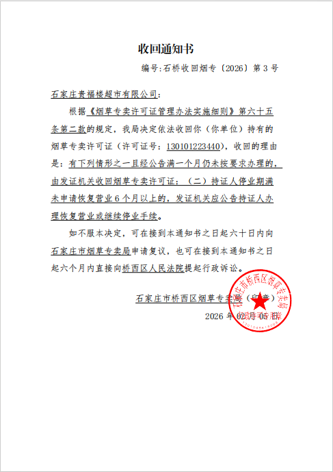 本局依据《烟草专卖许可证管理办法实施细则》第六十八条规定,作出收回你烟草专卖零售许可证(130101223440)的许可决定,现将《收回通知书》(石桥收回烟专〔2026〕第3号)予以公告送达。
