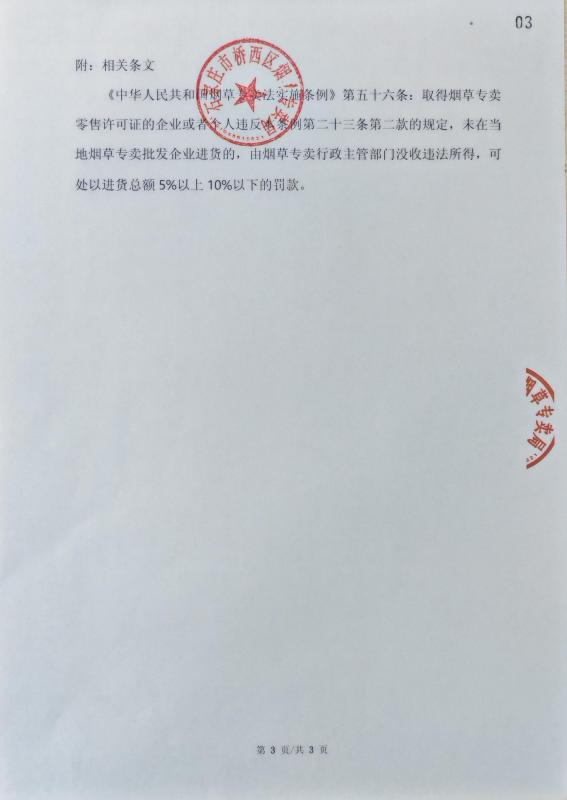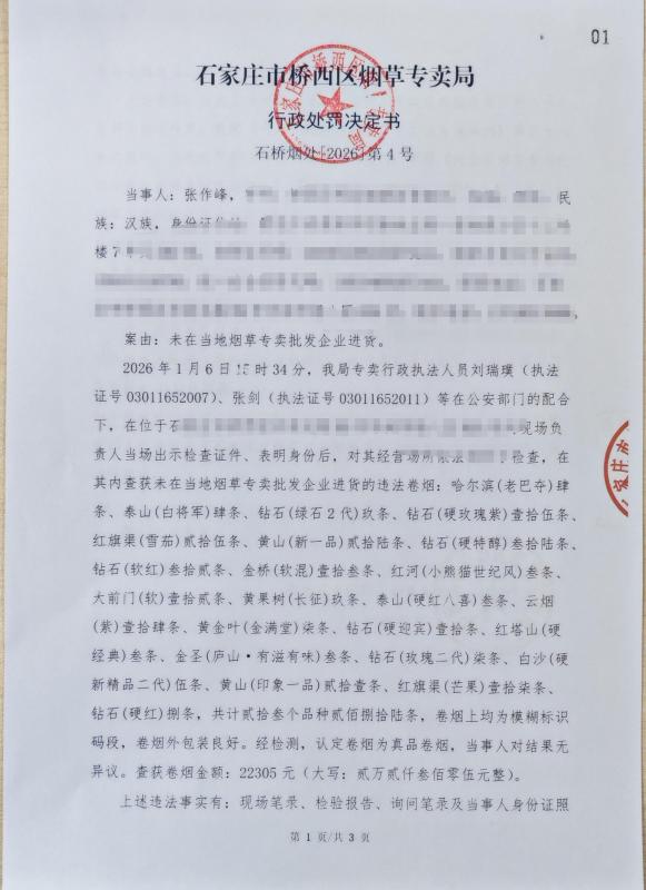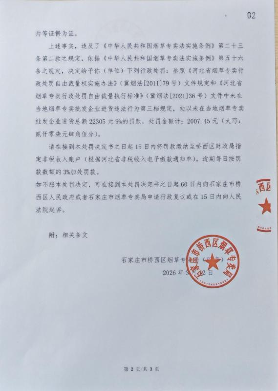 石家庄市桥西区烟草专卖局行政处罚决定书公示(石桥烟处【2026】第004号)