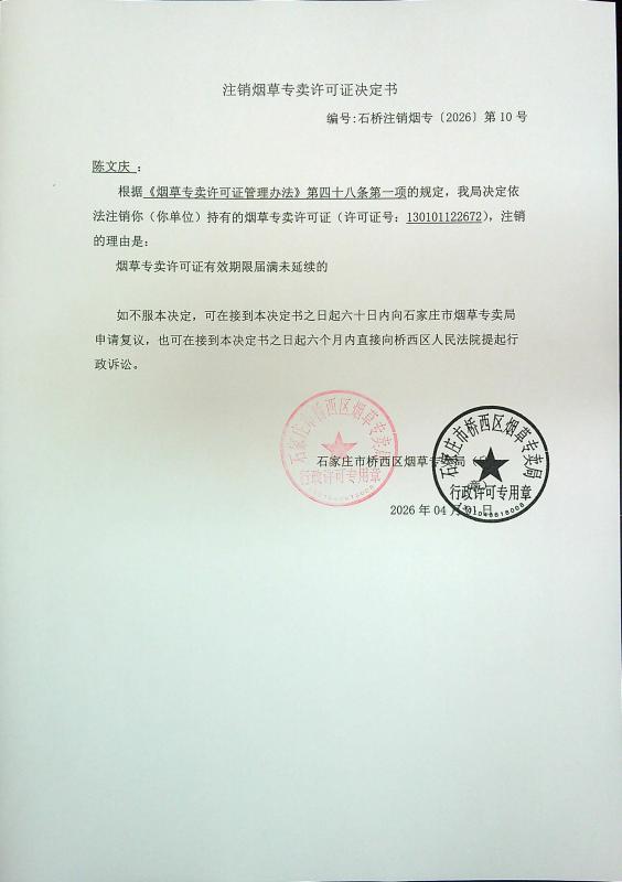 根据《烟草专卖许可证管理办法》第四十八条第一项的规定,我局决定依法注销你(你单位)持有的烟草专卖许可证(许可证号:130101122672),注销的理由是:烟草专卖许可证有效期限届满未延续的。现将《注销烟草专卖许可证决定书》(石桥注销烟专〔2026〕第10号)予以公告送达。