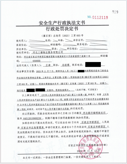 河北三禧物业服务有限公司特种作业人员(电工)刘满刚未按照规定经专门的安全作业培训并取得相应资格,上岗作业案