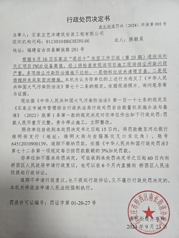 行政处罚南长街道立【2024】环保第003号 石家庄艺沣建筑安装工程有限公司工地违反工地作业规范