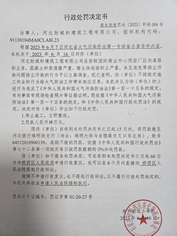 行政处罚南长街道立【2023】环保第006号 河北财赋轩建筑工程有限公司工地违反工地作业规范